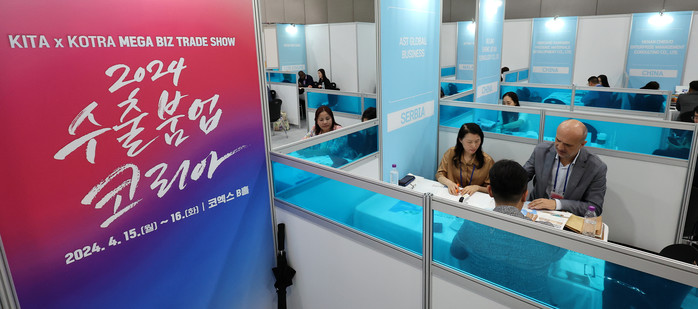 | ▲지난 4월 15일 서울 강남구 코엑스에서 열린 2024 상반기 수출붐업 코리아를 찾은 국내 업체 관계자가 해외바이어와 수출상담을 하고 있다.(사진=뉴스1) |