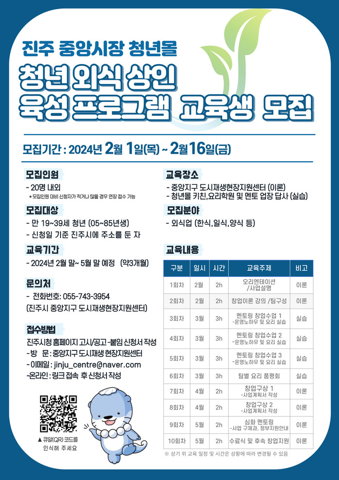 [프레스뉴스] 정호일 기자= 진주시는 지역 내 19세~39세 청년을 대상으로 하는 ‘청년외식상인 육성 프로그램’ 교육생을 1일부터 16일까지 모집한다.