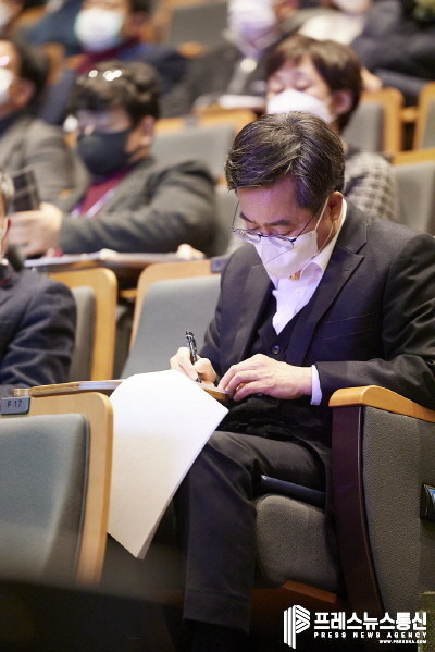 | ▲ 19일 오후 경기도청 1층 대강당에서 열린 기회경기 혁신포럼 ‘경바시(경기도를 바꾸는 시간)’에서 김동연 경기도지사가 발표를 경청하고 있다.(사진=경기도) |