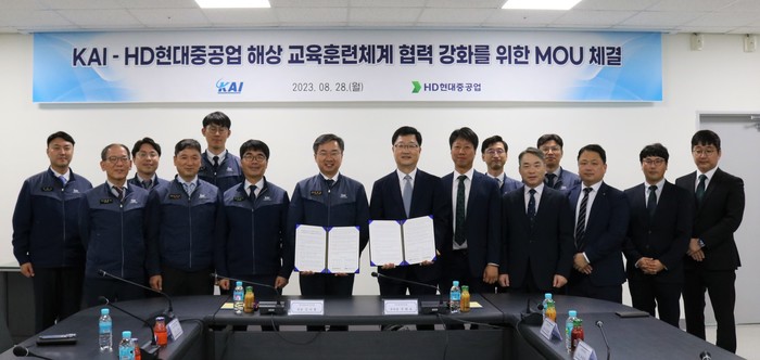 KAI와 HD현대중공업은 28일 KAI 사천 본사에서 ‘교육훈련체계 분야 상호협력에 관한 업무협약’을 체결했다.