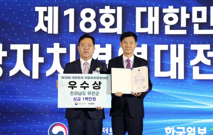 [전남=프레스뉴스] 강래성 기자= 전남 무안군(군수 김산)이 행정안전부와 한국일보가 공동 주최하는 제18회 대한민국 지방자치 경영대전에서 일자리분야 우수기관으로 선정돼 행정안전부 장관상을 수상했다.