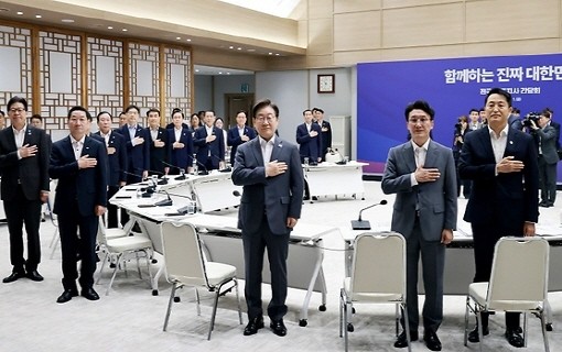 ▲이재명 대통령이 1일 서울 용산 대통령실 청사에서 열린 전국 시도지사 간담회에서 김민석 국무총리, 대한민국시도지사협의회장 유정복 인천광역시장 등 시도지사와 함께 국기에 경례하고 있다.(사진= 대통령실) |