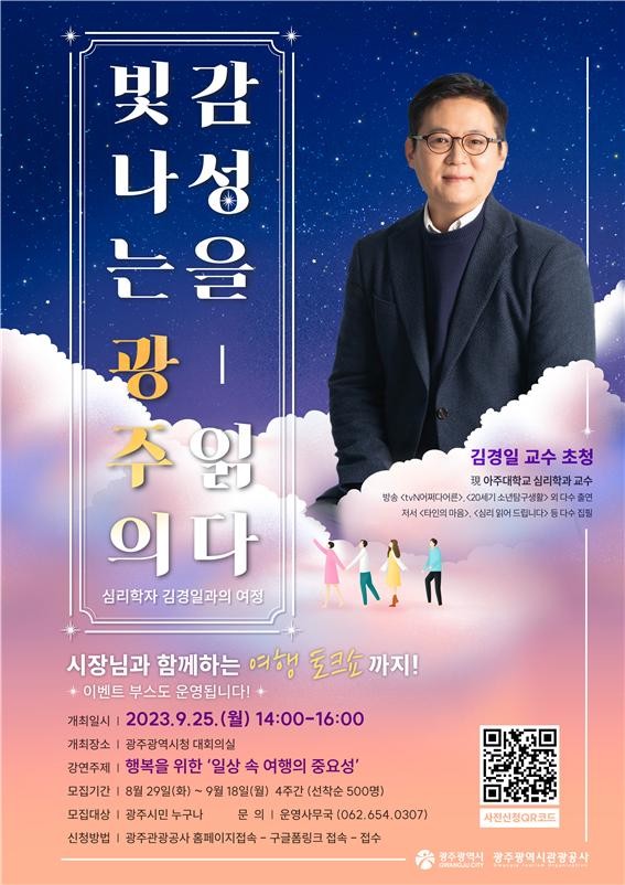 [광주=프레스뉴스] 강래성 기자= 광주광역시(시장 강기정)와 광주관광공사는 오는 25일 오후 2시 시청 대회의실에서 시민을 대상으로 ‘스타강사 김경일 교수 초청 여행특강’을 개최한다.