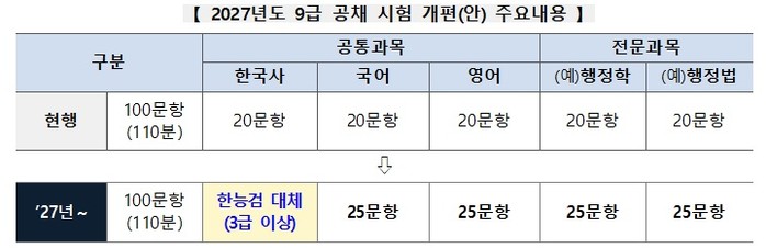 행정안전부와 인사혁신처는 이 같은 내용을 담은 '2027년도 9급 공채 시험 개편안'을 2일 공개했다.