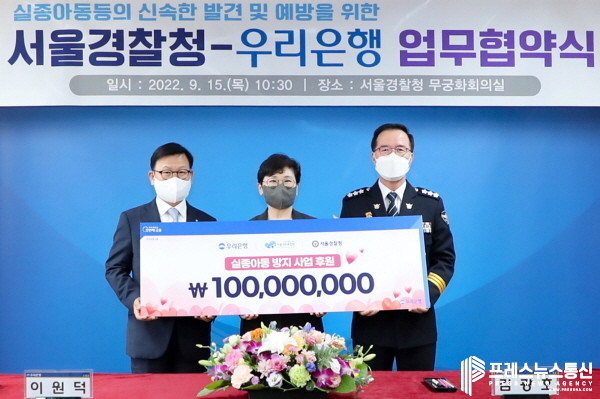 [프레스뉴스] 김대일 기자= 우리은행(은행장 이원덕)은 15일 서울 종로구에 소재한 서울경찰청에서 이원덕 우리은행장, 김광호 서울경찰청장과 양 기관 관계자들이 참석한 가운데 ‘실종아동의 신속한 발견 및 예방을 위한 업무협약’을 체결했다고 밝혔다.
