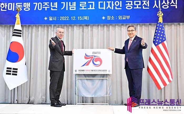 ▲ 박진 외교부 장관과 필립 골드버그 주한 미국대사가 지난해 12월 15일 정부서울청사에서 열린 한미동맹 70주년 기념 로고 디자인 공모전 시상식에서 최우수상 작품을 공개하고 있다.(사진=외교부) |