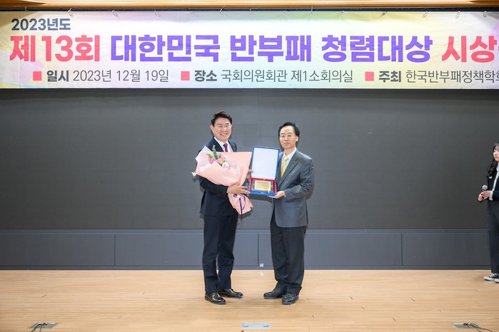 ‘대한민국 반부패청렴 대상’은 투명하고 공정한 정치·행정·사회문화 확립에 기여한 정치인·공직자 등을 선정하고 대한민국의 청렴 사회를 구현하기 위해 한국반부패정책학회(회장 김용철)에서 주관하는 의미 있는 행사이다.