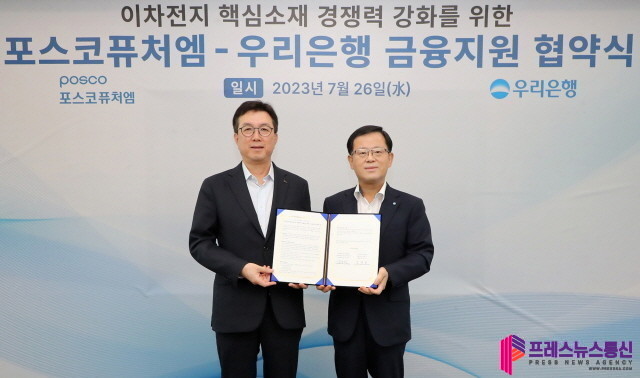 [프레스뉴스] 김대일 기자= 우리은행(은행장 조병규)은 국내 유일의 이차전지 양·음극재 동시 생산 기술을 보유한 ㈜포스코퓨처엠과 “이차전지 핵심소재 경쟁력 강화를 위한 금융지원 업무협약”을 체결했다고 26일 밝혔다.