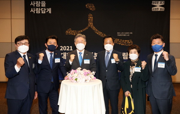 ▲ 28일 2021 대한민국 기본소득 박람회 참석_(왼쪽부터)경기도의회 박관열 의원, 박근철 의원, 이재명 경기도지사, 경기도의회 장현국 의장, 심규순 의원, 최승원 의원. |