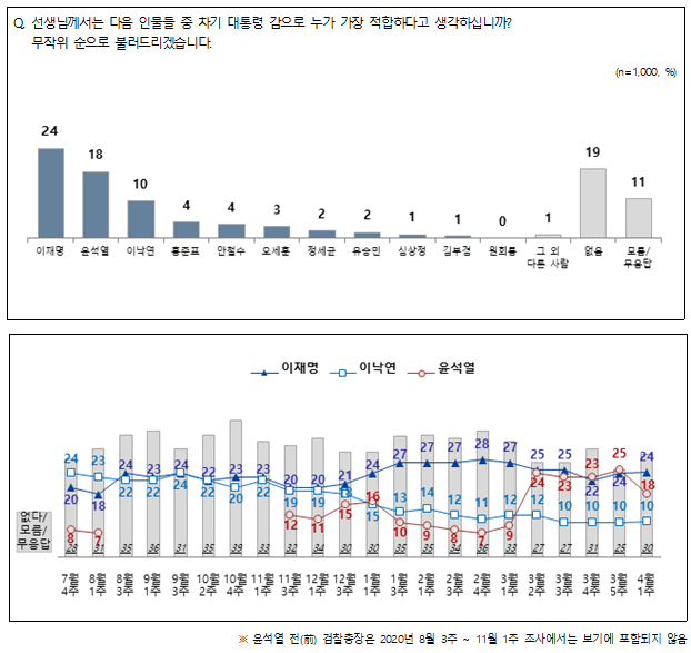 이어 윤 전 총장은 지난번 조사보다 7%p 하락한 18%로 2위를 차지했으며, 이낙연 더불어민주당 전 대표는 10% 지지율로 3위를 유지했다.