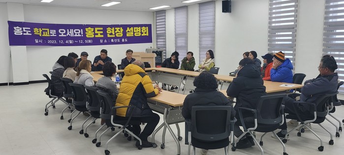 흑산도 홍도분교 전학(입학)을 희망하는 12세대를 선발하여 올해 11월 23일부터 11월 24일까지 1차 현장 설명회를 계획했으나 무산되고, 바로 다음 주 11월 28일부터 29일까지 2차 계획도 마찬가지로 태풍주의보 발효 때문에 연기되었다. 그리고 마침내 이번 12월 4일부터 12월 5일까지 3번째 도전 끝에 현장 방문과 설명회를 마무리할 수 있었다.