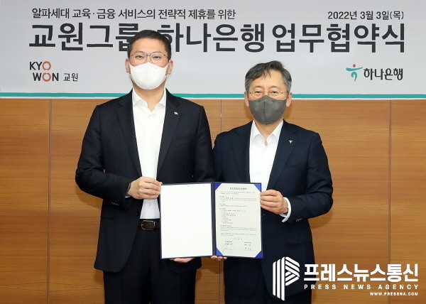 [프레스뉴스] 김대일 기자= 하나은행(은행장 박성호)은 3일 서울 중구 을지로에 위치한 교원그룹 본사에서 교원그룹(회장 장평순)과 키즈 금융교육을 위한 전략적 업무협약을 체결했다고 밝혔다.