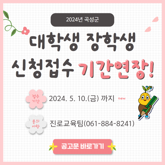 성적 기준과 구비서류는 곡성군미래교육재단 홈페이지의 선발공고에서 확인할 수 있으며, 자세한 사항은 곡성군미래교육재단 진로교육팀(061-884-8241)로 문의하면 된다.