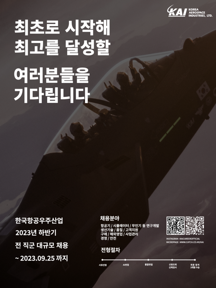 [프레스뉴스] 정호일 기자= KAI(한국항공우주산업(주))가 미래 항공우주산업의 주역이 될 신입사원 모집을 위해 2023년 하반기 대규모 공개채용에 나섰다.