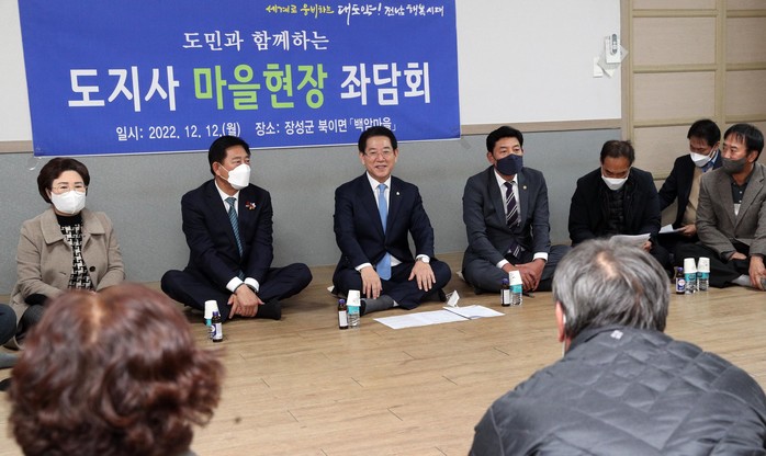 [전남=프레스뉴스] 강래성 기자= 김영록 전라남도지사는 12일 장성 북이면 백암마을을 찾아 김한종 장성군수, 정철 전남도 의원, 주민 20여명이 참여한 가운데 ‘도지사 마을 현장 좌담회’를 열고, 마을 발전계획과 건의사항 청취 등 소통의 시간을 가졌다.
