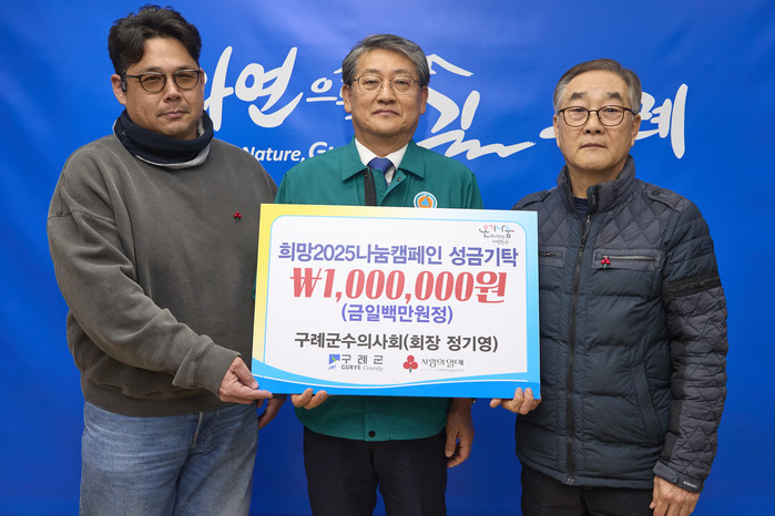 김순호 구례군수는 “수의사회와 정가축병원의 지속적인 나눔 실천에 진심으로 감사드린다”며 “혹한기에 어려움을 겪는 이웃들에게 성금을 소중히 전달해 따뜻한 겨울을 보낼 수 있도록 하겠다”고 말했다.