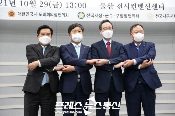 ▲ 황명선 전국시장군수구청장협의회 대표회장(왼쪽 두번째) 등 지방4대 협의체장이 자치분권 2.0 공동선언을 한 뒤 결의를 다지고 있다.(사진=전국시장군수구청장협의회) |