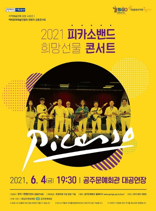 [프레스뉴스] 강기동= 공주 음악인들의 특색을 갖춘 공주피카소밴드가 오는 4일 오후 7시 30분 공주문예회관 대공연장에서 ‘희망선물 콘서트' 를 통해 화려한 무대가 장식된다.
