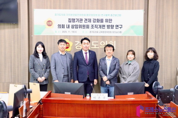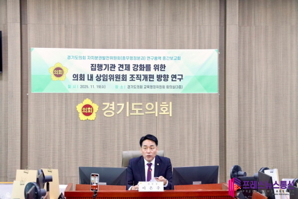 [프레스뉴스] 류현주 기자= 경기도의회 자치분권발전위원회 총무행정분과(위원장 이은주)는 11월 19일(수) 도의회 교육행정위원회 회의실에서 「집행기관 견제 강화를 위한 의회 내 상임위원회 조직개편 방향 연구」 중간보고회를 개최하며, 향후 의원 정수 확대와 정책 환경 변화에 대응하기 위한 상임위원회 재구조화 방안을 논의했다.