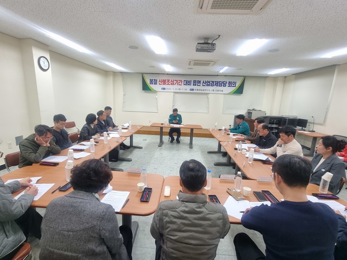▲고성군은 25일 고성군 농업기술센터 친환경농업연구소 2층 소회의실에서 2025년 봄철 산불조심기간 대비 읍·면 산업경제담당 회의를 개최하고 봄철산불대책기간 중점추진대책 보고 및 협조 사항에 대해 논의했다. (사진=고성군) |