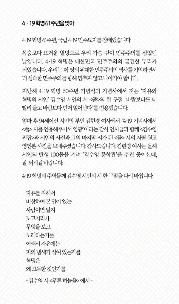 이어 "4·19혁명의 주역들께 김수영 시인의 한 구절을 다시 바친다"며 <푸른 하늘을>의 한 구절을 인용했다.
