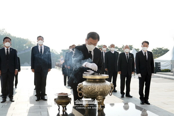 ▲ 문 대통령이 19일 오전 국립 4.19 민주묘지 기념탑에서 분향하고 있다. (사진= 청와대) |
