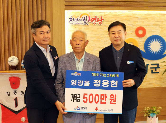 | ▲정용현 어르신이 영광곳간에 기탁금 500만 원을 전달했다.(사진제공=영광군) |