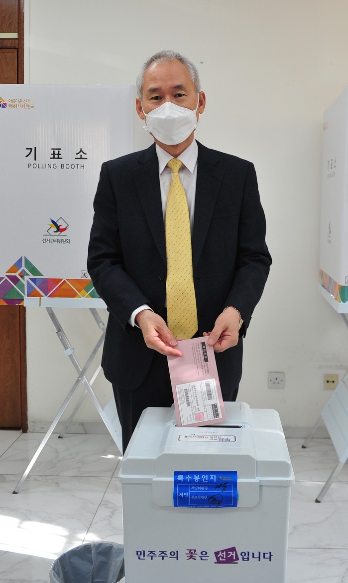 [프레스뉴스] 채정병 특파원=23일(현지시간) 제20대 대통령선거 요르단 재외국민투표가 28일까지 6일간(오전 8시~오후 5시) 주 요르단 대한민국 대사관에 마련된 재외투표소에서 진행 중인 가운데 이재완 주 요르단 대사가 투표하고 있다. 이번 선거에는 218명의 우리국민이 투표신청을 마쳤고, 지난 19대 대선에는 305명이 참여해 92.1%의 투표율을 기록 했다.