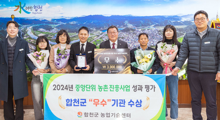 | ▲합천군(군수 김윤철)은 지난 18일 경상남도농업기술원에서 열린 2024년도 농촌진흥사업 평가에서 중앙단위 ‘우수’ 기관으로 선정되어 청장 표창패와 시상금을 수상했다. (사진=합천군) |