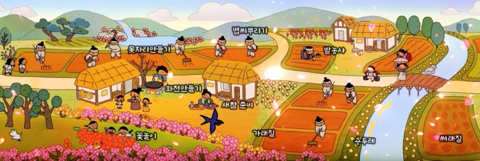 인터렉티브 미디어 월은 ‘농촌으로 떠나는 시간여행’으로 조선시대 농가월령가를 애니메이션 기법을 가미해 표현했다. 상영 시간 10분 동안 4계절 농사와 세시풍속을 영상으로 즐길 수 있으며 캐릭터를 손으로 터치하면 또 다른 영상이 활성화돼 재미와 몰입도를 올렸다.