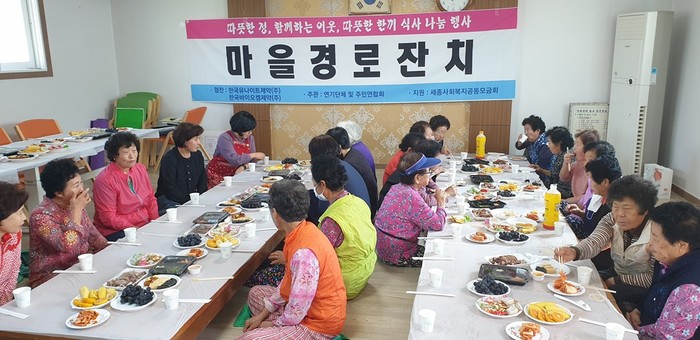 ▲ 연기 단체 및 주민연합회가 지난 7일 보통1리와 눌왕1리 마을회관에서 경로잔치를 개최했다.(사진=주민연합회 제공) |