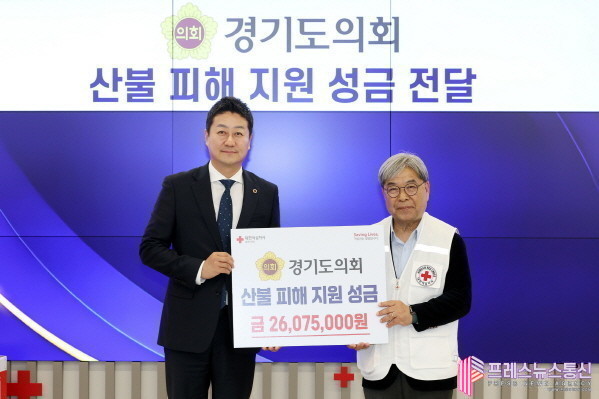 [프레스뉴스] 류현주 기자= 경기도의회(의장 김진경)는 11일 대한적십자사에 영남지역 대규모 산불 피해 복구 지원과 주민 일상 회복을 위해 모은 성금 2,607만여 원을 대한적십자사 경기지사를 통해 전달했다.