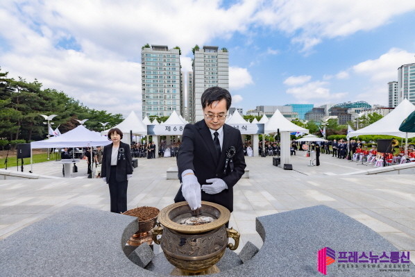 ▲ 6일 오전 수원현충탑에서 열린 제68회 현충일 추념식에서 김동연 경기도지사가 분향을 하고 있다. (사진=경기도) |