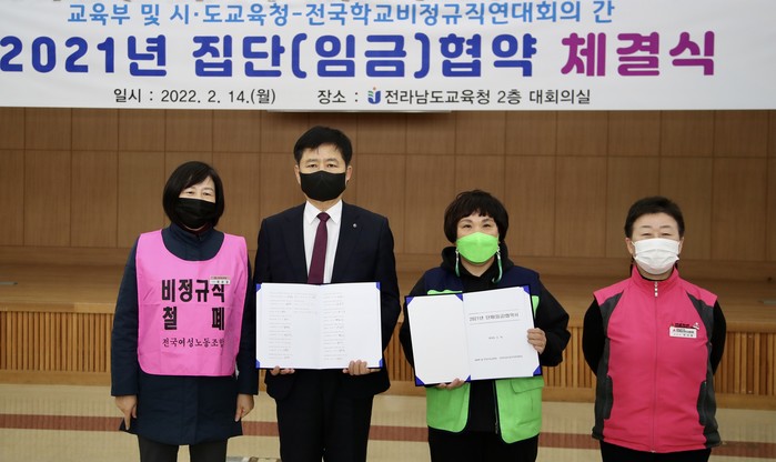 [전남=프레스뉴스] 강래성 기자= 교육부 및 17개 시도교육청이 14일(월) 전라남도교육청에서 전국학교비정규직연대회의(참여노조: 전국학교비정규직노동조합, 공공운수노동조합 전국교육공무직본부, 전국여성노동조합)와 2021년 집단(임금)협약을 체결했다.