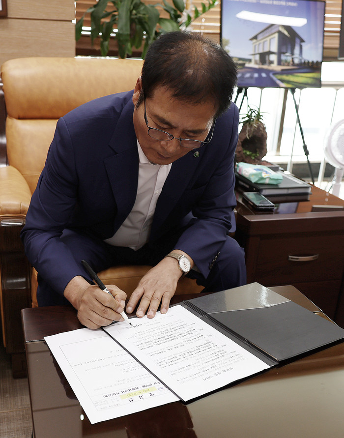 | ▲ 첫 결재로 청렴서약서에 서명했다./함평군 제공 |