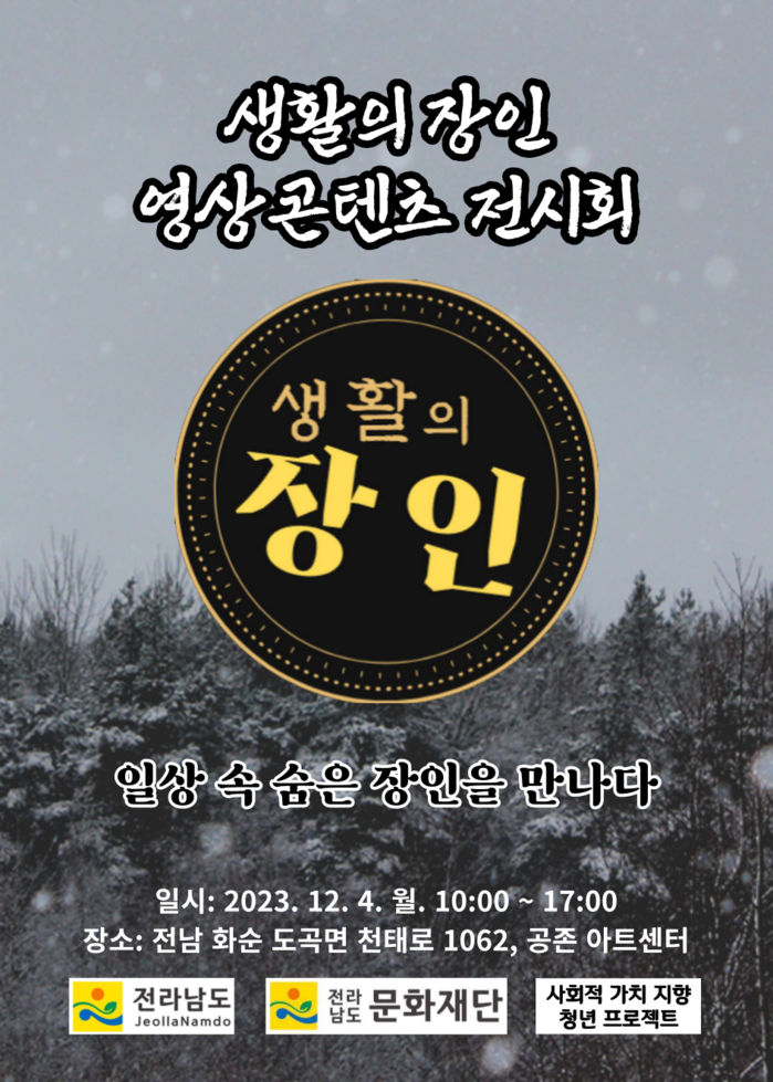 이번 전시회는 전라남도와 전라남도문화재단의 후원을 받아 진행되는 행사로 ‘사회적 가치지향 청년 프로젝트’를 진행하면서, 화순군에 오랫동안 거주한 생활의 장인분들을 만나 그분들의 일상을 영상 콘텐츠로 제작해 유튜브 ‘생활의 장인’ 채널에 등재하여 전남 화순 지역을 널리 홍보하는데 목적이 있다.