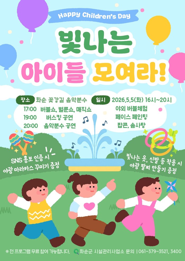 윤재관 홍보소통담당관은 “어린이날을 맞아 아이들이 마음껏 뛰놀고 웃을 수 있는 하루가 되길 바란다”라며, “어린이날 축제에 남녀노소 전 세대가 함께하길 기대한다”라고 밝혔다.