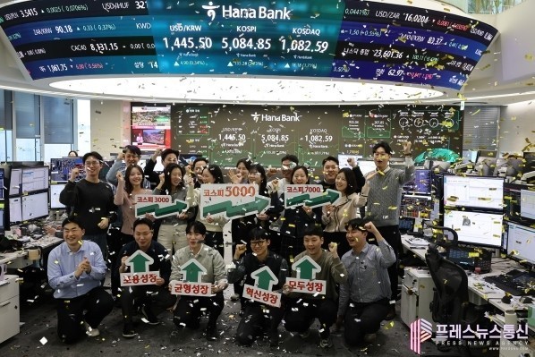 [프레스뉴스] 류현주 기자= 27일 오후 서울시 중구 하나은행 딜링룸에서 딜러들이 코스피 5,000 시대 개막을 축하하고 있다.