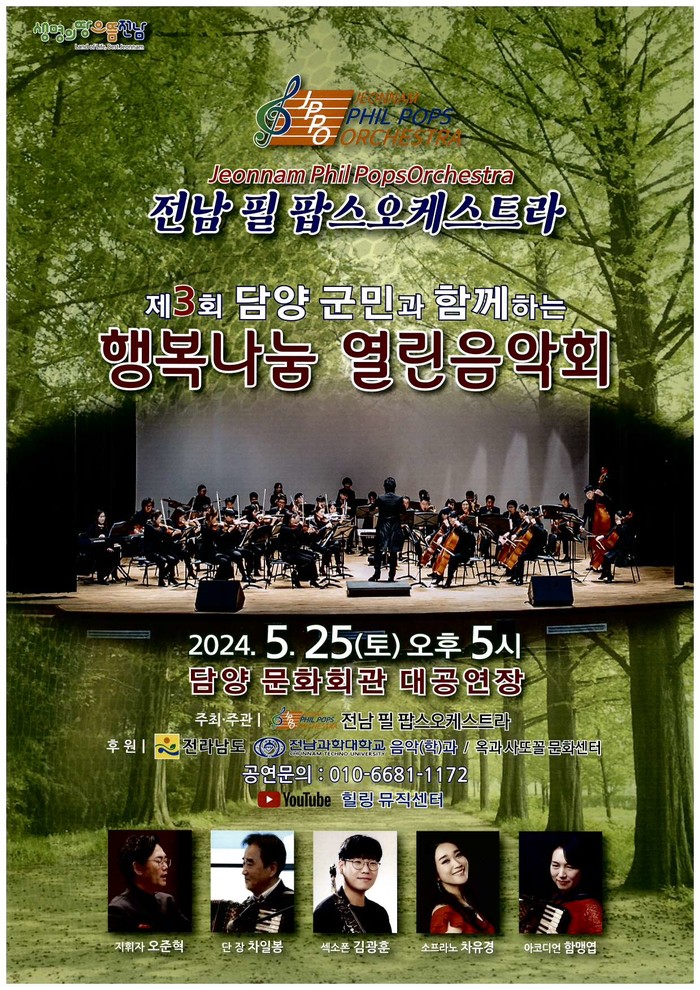 전남 필 팝스오케스트라는 지난 2월 순천문화예술회관 공연을 시작으로 전남 지역민들에게 음악의 힘으로 위안과 힐링의 시간을 제공하고자 전남권 순회공연을 진행하고 있으며, 이번 공연은 담양군민과 함께하는 행복 나눔 테마로 다양한 곡들을 공연할 예정이다.