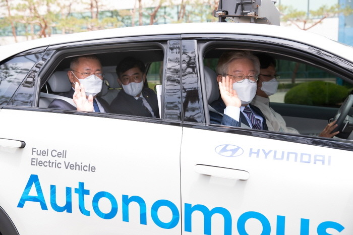 | ▲ 24일 오전 화성시 현대자동차·기아 기술연구소에서 이재명 경기도지사, 김병욱 국회의원, 정의선 현대자동차그룹 회장이 자율주행차(넥쏘)에 탑승하여 현대디자인동으로 이동하고 있다. |