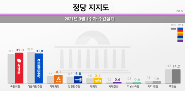 전국 지지율은 국민의힘 32%, 민주당 31%로 박빙이었다.