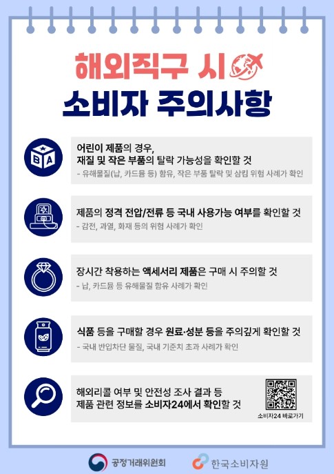 공정위와 소비자원은 “해외직구로 제품을 구매할 때는 제품의 구성·성분 등을 주의 깊게 살피고 소비자24 또는 소비자위해감시시스템을 통해 해외 리콜 정보 및 안전성 조사 결과도 확인해 달라”고 당부했다.
