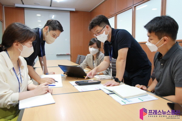 | ▲ 우리은행(은행장 이원덕)은 30일부터 직원들의 창의적 아이디어를 바탕으로 실제 사업화를 추진하는 ‘2022 Great Challenge Award 혁신아이디어 공모전’ 을 개최한다. 직원들이 혁신 아이디어 공모를 위한 회의를 진행하고 있다.(사진=우리은행) |