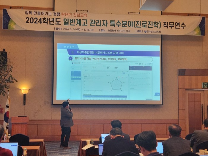 특히 연수 참가자들은 대학 평가시스템과 동일하게 올해 새롭게 구축한 전남형 학생부종합전형 모의 서류평가 실습을 통해 효율적인 학교생활기록부 기재 전략, 교육과정 편성 및 평가, 수능 성적이 진학에 미치는 영향을 분석하고 의견을 나눴다.