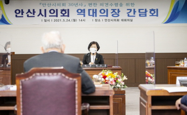 ▲ 안산시의회는 지방의회 개원 30주년을 맞아 ‘의회 30년사’를 발간한다. 사진은 의회가 30년사 발간을 위해 역대 의장들의 의견을 수렴하고자 지난 5월 24일 개최한 역대의장 간담회 중 한 장면.(사진=안산시의회) |