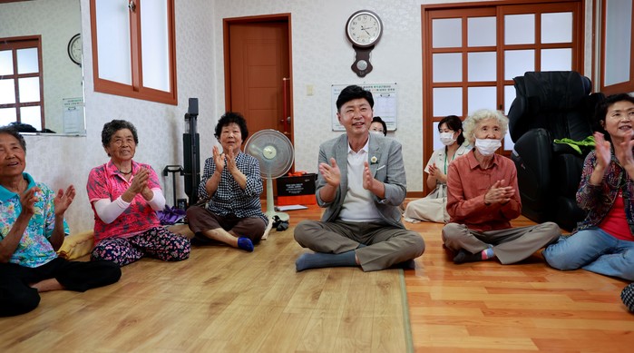 | ▲내 부모님처럼 함께 모시는 노인 복지_김철우 군수가 회천면 경로당을 방문해 경로당 더위나기 프로그램에 참여하고 있다/보성군 제공 |