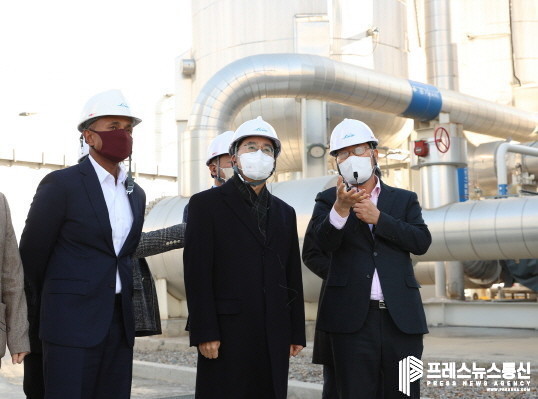 | ▲ 3일 오후 린데코리아 평택공장에서 김동연 경기도지사, 정장선 평택시장, 존 패니카 린데 아시아태평양 회장, 성백석 린데코리아 회장 등 관계자들이 산업가스 생산시설을 시찰하고 있다.(사진=경기도) |