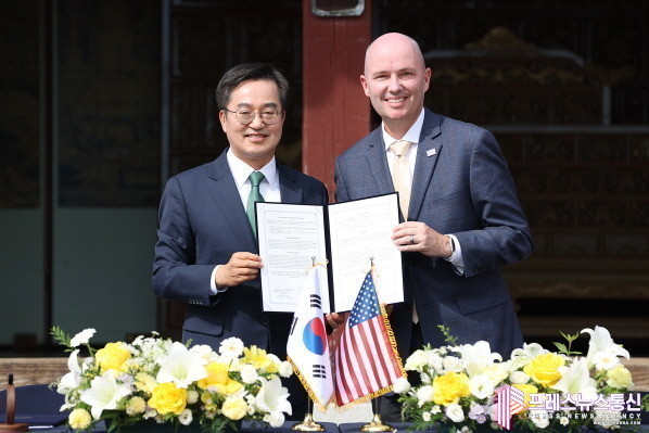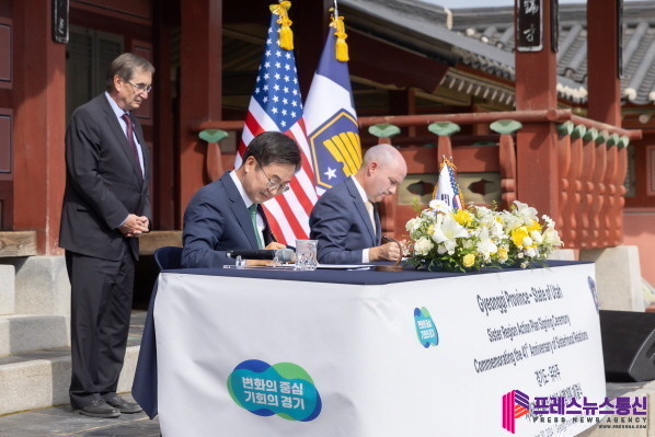 | ▲30일 오전 화성행궁에서 열린 경기도-유타주 MOU 체결식에서 김동연 경기도지사와 미국 유타주 스펜서 제임스 콕스 주지사가 경기도-유타주 MOU 협약서에 서명을 하고 있다.(사진=경기도) |