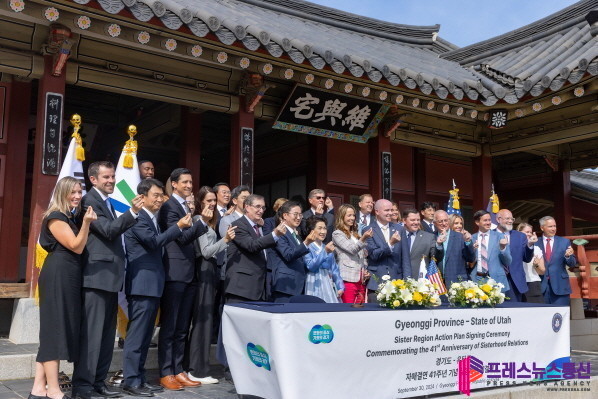 | ▲30일 오전 화성행궁에서 열린 경기도-유타주 MOU 체결식에서 김동연 경기도지사와 미국 유타주 스펜서 제임스 콕스 주지사가 경기도-유타주 MOU 협약서에 서명하고 기념촬영을 하고 있다.사진=경기도) |