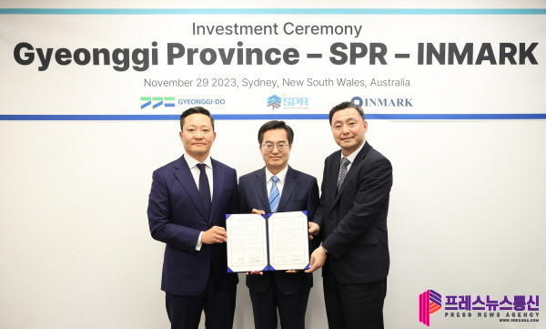| ▲ 현지시간 29일 오후 코트라 시드니무역관에서 열린 경기도-SPR-INMARK 투자행사에서 김동연 경기도지사, 지호준 인마크 글로벌 상무, 최흥용 SPR 부사장이 기념촬영을 하고 있다.(사진=경기도) |